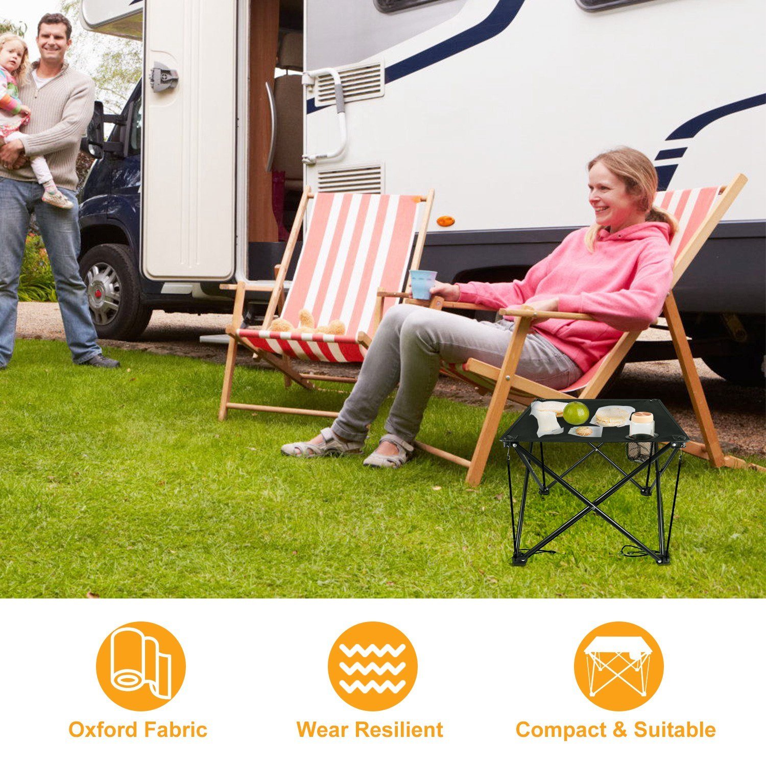 **STURDY & DURABLE TABLE TOP*:Made from thickened 600D oxford fabric materials,the table top of our table is tear-proof,scratch-resistant,abrasion-resistant and stain-resistant. And its back side is coated with waterproof layer to protect against water permeation.